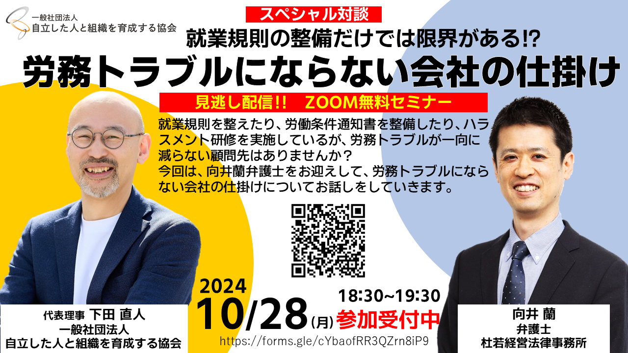 今回は、向井蘭弁護士をお迎えして、最近の労務トラブルの傾向や要因、そして、労務トラブルにならない会社の仕掛け、今後、社労士にとってどのような準備が必要になってくるのか等について、社労士の下田直人と対談方式でお話しをしていきます。