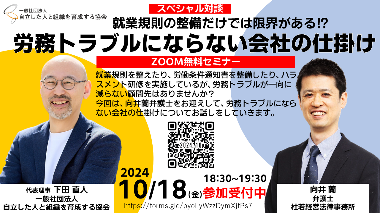 今回は、向井蘭弁護士をお迎えして、最近の労務トラブルの傾向や要因、そして、労務トラブルにならない会社の仕掛け、今後、社労士にとってどのような準備が必要になってくるのか等について、社労士の下田直人と対談方式でお話しをしていきます。