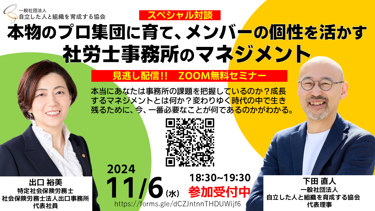 現在、本物のプロ集団に育て、メンバーの個性を活かす社労士事務所のマネジメントを実践している出口先生をお迎えし、社労士の下田直人と対談方式で社労士事務所のマネジメントについてお話しをしていきます。変わりゆく時代の中で生き残るために、今、一番必要なことが何であるのかがわかります。