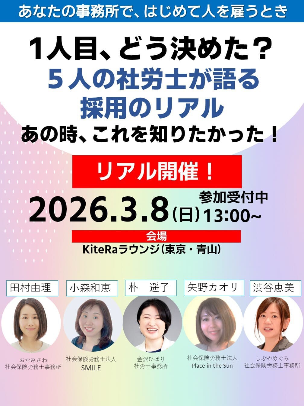 本セミナーでは、社労士事務所ならではの採用の壁・不安・失敗と成功の実例、そして、どのように意思決定してきたのか、そのプロセスまで赤裸々に共有します。